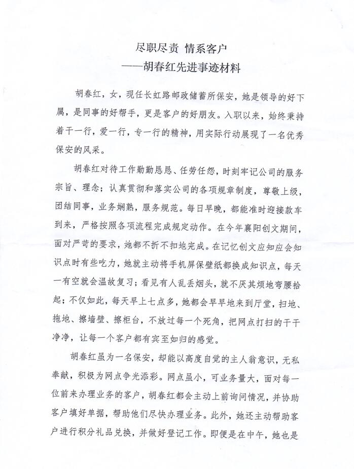 胡春紅,女,現(xiàn)任長虹路郵政儲(chǔ)蓄所保安,她是領(lǐng)導(dǎo)的好下屬,是同事的好幫手,更是客戶的好朋友。入職以來,始終秉持著干一行,愛一行,專一行的精神,用實(shí)際行動(dòng)展現(xiàn)了一名優(yōu)秀保安的風(fēng)采。胡春紅對(duì)待工作勤勤懇懇、任勞任怨,時(shí)刻牢記公司的服務(wù)宗旨、理念;認(rèn)真貫徹和落實(shí)公司的各項(xiàng)規(guī)章制度,尊敬上級(jí),團(tuán)結(jié)同事,業(yè)務(wù)嫻熟,服務(wù)規(guī)范。每日早晚,都能準(zhǔn)時(shí)迎接款車到來,嚴(yán)格按照各項(xiàng)流程完成規(guī)定動(dòng)作。在今年襄陽創(chuàng)文期間,面對(duì)嚴(yán)苛的要求,地都不折不扣地完成。在記憶創(chuàng)文應(yīng)知應(yīng)會(huì)知識(shí)點(diǎn)時(shí)有些吃力,她就主動(dòng)將手機(jī)屏保壁紙都換成知識(shí)點(diǎn),每天有空就會(huì)溫故復(fù)習(xí):看見有人亂丟煙頭,就不厭其煩地彎腰拾起;不僅如此,每天早上七點(diǎn)多,她都會(huì)早早地來到廳堂,掃地拖地、擦墻壁、擦柜臺(tái),不放過每一個(gè)死角,把網(wǎng)點(diǎn)打掃的干干凈凈,讓每一個(gè)客戶都有賓至如歸的感覺。胡春紅雖為一名保安,卻能以高度自覺的主人翁意識(shí),無私幸獻(xiàn),積極為網(wǎng)點(diǎn)爭光添彩。網(wǎng)點(diǎn)雖小,可業(yè)務(wù)量大,面對(duì)每位前來辦理業(yè)務(wù)的客戶,胡春紅都會(huì)主動(dòng)上前詢問情況,并協(xié)助客戶填好單據(jù),幫助他們盡快辦理業(yè)務(wù)。此外,她還主動(dòng)幫助客戶進(jìn)行積分禮品兌換,并做好登記工作。即便是在中午,她也是匆忙吃過飯后,主動(dòng)放棄午休,繼續(xù)投入到工作中。由于網(wǎng)點(diǎn)只能辦理金融業(yè)務(wù),有些客戶不知情,進(jìn)店詢問郵務(wù)類業(yè)務(wù),甚至只是嚼水、問路,胡春紅都會(huì)熱情迎客,耐心解答,做到知無不言,言無不盡視客戶如親人,這是胡春紅一直堅(jiān)持的信念,對(duì)待每位客戶胡春紅都做到了來有迎聲,走有送聲,不僅如此,她還想客戶之所想,急客戶之所急她所在的網(wǎng)點(diǎn)有兩位特殊的客戶,由于偏癱,每月都必須由年邁的母親騎著三輪車帶女幾來領(lǐng)低保,母親沒有什么文化,也不會(huì)寫字,每次母女兩剛到門口,胡春紅都會(huì)馬上迎出門去,攙扶客戶進(jìn)店,幫助客戶填單,同時(shí)還會(huì)噓寒問暖,問問母女兩有沒有什么困難需要幫助??蛻羰指屑?多次提出送點(diǎn)禮物給胡春紅,也都被她一一謝絕了。